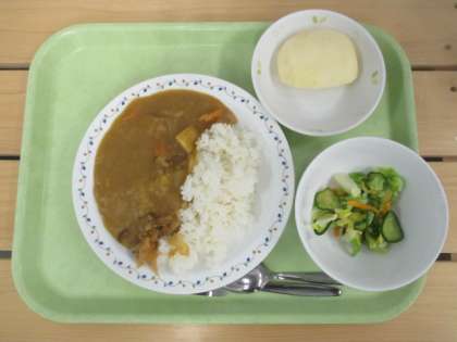 今日から1年生も始まり、全校500名近くの給食作りがスタートしました。給食室のチーフは1年生のスタートだからと、カレー粉を少し減らし辛さを調節してくれました。1年生も「おいし〜い!」とよく食べてくれて、カレーライスの食缶は、空っぽになりました。