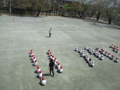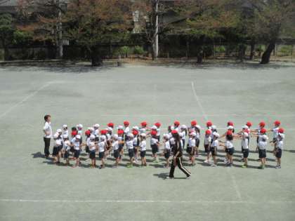 1年生は学年合同での体育の授業を行いました。春のさわやかな青空の下、整列の仕方や集合の練習をしていました。広い校庭をみんなで元気に走り回り、とても楽しそうでした。