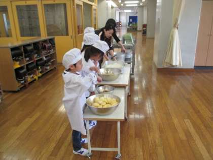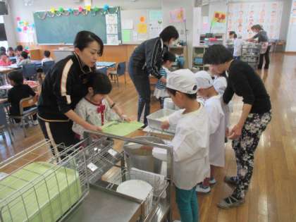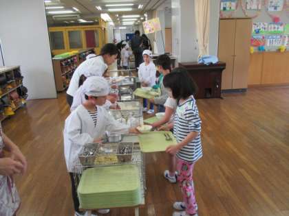 今日から1年生も給食が始まりました。初日はみんなの大好きなカレーライスです。準備の仕方を教わり、給食当番は配膳の仕方も練習しました。