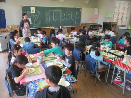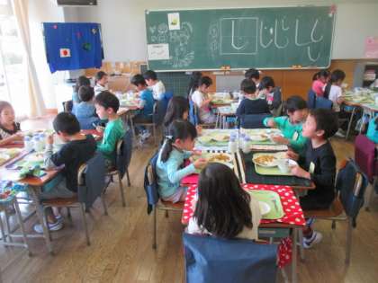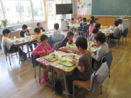 最初は、「もぐもぐタイム」です。おしゃべりをせず、食べることに集中します。「おいしい!」「楽しい!」という感想が聞かれ、初めての給食、みんなしっかり食べられました。また、来週もモリモリ食べて、元気に過ごしましょうね。