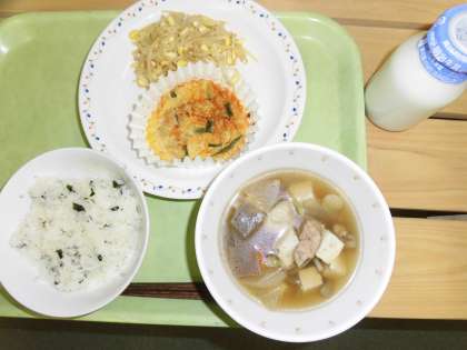 「わかめごはん、卵焼き、豆もやしのごま風味、けんちん汁、牛乳」です。
