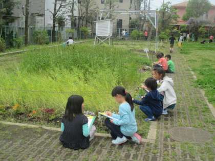 3年2組は、理科の授業で春の植物の観察をしました。園庭を巡りながら、気になる春の植物を、自分の目で見て、触って観察し、スケッチしていました。春の息吹を感じながらの授業でした。