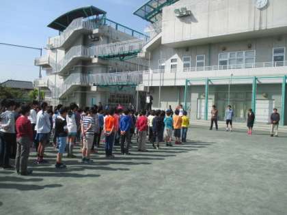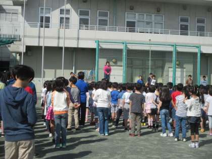 今朝の全校朝会は、4月の「人格の完成をめざして」のテーマ『あいさつ』について、副校長より話がありました。いつでも、どこでも、誰に対しても、自分からすすんであいさつすることが大切です。その後、看護当番の先生からも、元気にあいさつしようという今週の目標が伝えられ、全校児童で練習をしました。校庭には、元気な「おはようございます!」の声が響き渡り、3階から聞いていた先生が合格の合図を出してくれました。明日の登校時にも、あいさつキャンペーンがあります。毎日の元気なあいさつでスタートすると、1日気分よく過ごせると思いますので、みんなでやっていきましょう。