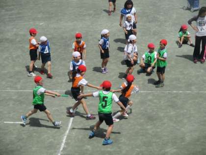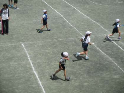 青の青空の下、3年2組が校庭で体育の授業をしていました。バトンの受け渡し方、コースの位置取りの仕方などに説明を受けました。最後にグループに分かれてリレー競走をしました。一人トラックを半周、みんな必死になってバトンをつないでいました。