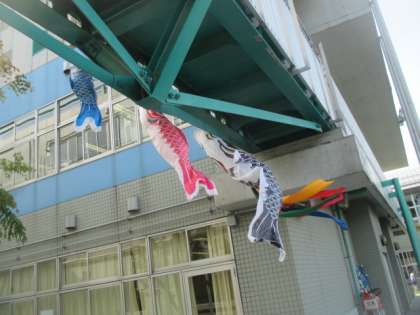 校庭に鯉のぼりがあがりました。春の風になびいて、気持ちよさそうに泳いでいます。