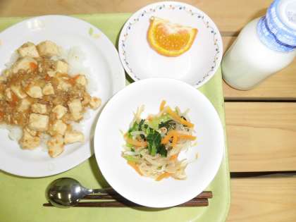 「麻婆豆腐丼、ナムル、マンダリンオレンジ、牛乳」です。