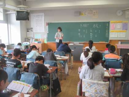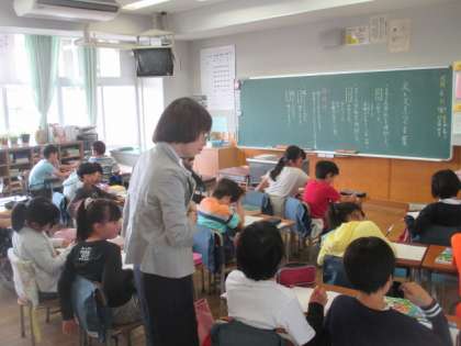 2組では、国語の学習で、「文と文とをつなぐ言葉」の授業を行いました。2つの例文を読み、その違いについて意見を出し合って接続語の働きを考えます。どの子もノートもきちんととりながら、先生の問いかけに対しては意欲的な発言が見られました。連休明けですが、子どもたちは集中して授業を受けています。