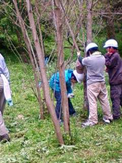 昼食後、川場村の方の協力で、環境学習(林業体験)をしました。間伐処理、椎茸のこまうち、植林の三つの作業に挑戦。何故、その作業が環境のためになるのかも教えていただきました。写真は間伐処理作業の子どもたちです。