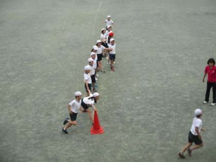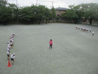 曇り空から時折晴れ間ものぞく校庭では、4年生が元気に体育の授業を行っていました。2組はリレー形式の競走で、楽しそうに校庭を走っていました。