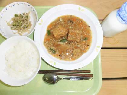 「ごはん、生揚げのそぼろあんかけ、ごま酢かけ、牛乳」です。