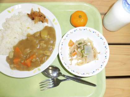 「チキンカレーライス、福神漬け、こんにゃくサラダ、冷凍みかん、牛乳」です。
