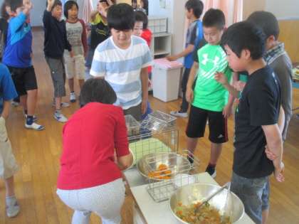 今年も八幡山小学校の給食の時間の救世主、「給食のおかわり隊」が活躍しています。高学年を中心に、職員室の食缶をもって栄養士の先生や事務主事さん方が、各教室の食缶に追加したり、おかわりしたい児童には直接配膳したりしてくれます。今日はカレーと冷凍ミカンとあって、高学年の子どもたちはしっかりおかわりをしていました。
