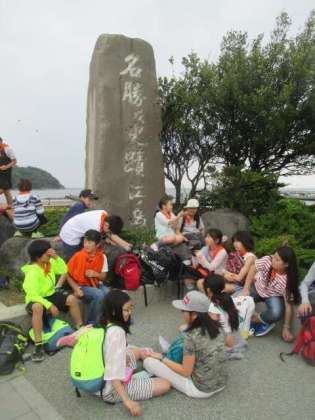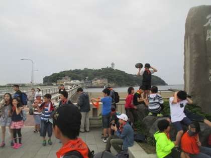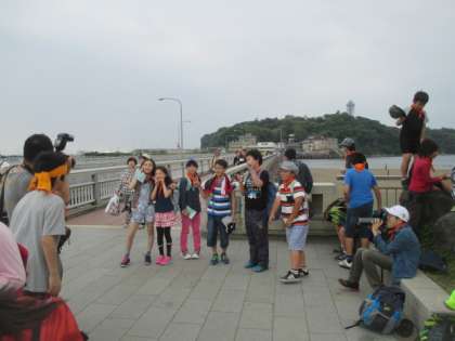 江の島をバックに写真を撮りました。