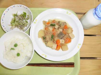 「グリンピースごはん、新じゃがのそぼろ煮、キャベツのゆかりかけ、牛乳」です。