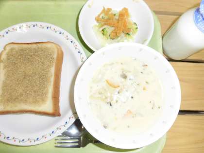「セサミトースト、クラムチャウダー、パリパリサラダ、牛乳」です。