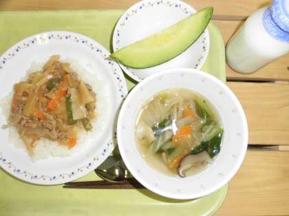 「スタミナ丼、白菜スープ、メロン、牛乳」です。
