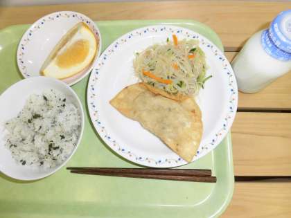 「わかめとじゃこのごはん、ジャンボ餃子、春雨サラダ、宇和ゴールド、牛乳」です。