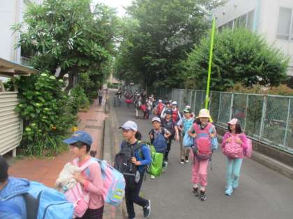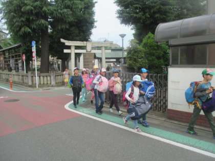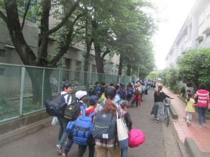バスの発着場所まで移動です。しっかり前を向いて、列を乱さないように歩きます。