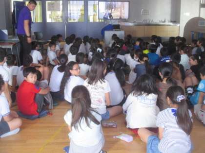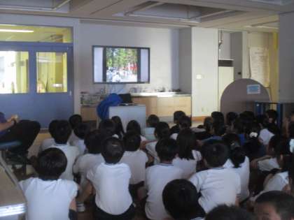 6年生は、総合的な学習の時間で、夏休みに参加する日光林間学園に向けて、担任が編集したビデオの上映をしました。東照宮の説明や宿泊先の様子など、映像を通して関心を深めることがねらいです。子どもたちは真剣に映像に見入り、時に歓声が上げるなど、楽しみにしていることが伝わってきました。