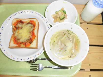 「ピザトースト、ビーンズサラダ、ヌードルスープ、牛乳」です。