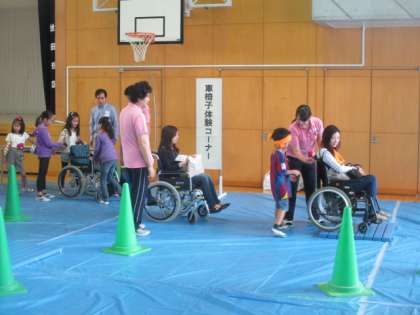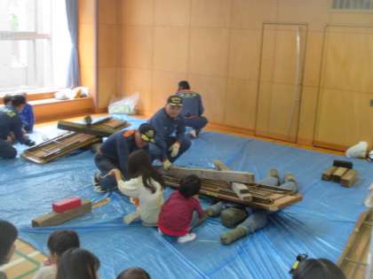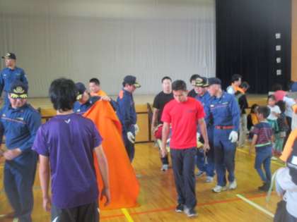 救出訓練・担架搬送法訓練・車いす体験コーナーでの様子です。明治大学や日本大学の学生さんにもお手伝いいただきました。