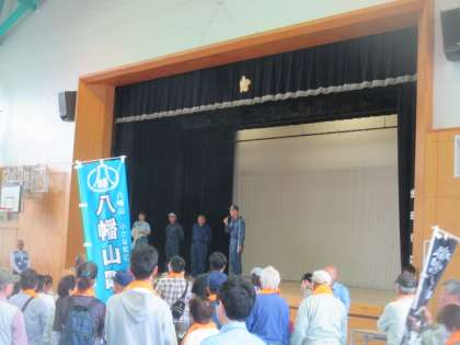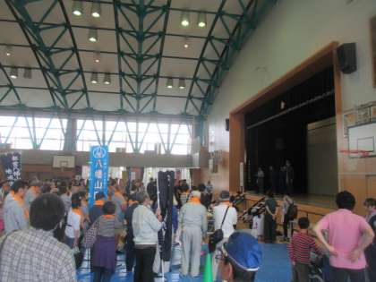 およそ1時間の体験・訓練を終え、閉会式です。成城消防署千歳出張所所長様より、講評をいただきました。今回は雨天で体育館での開催となり、300名程度の参加者を想定していたところ、なんと413名もの方々に参加していただきました。地域住民の皆様の、地区防災への関心の高さが伺えました。