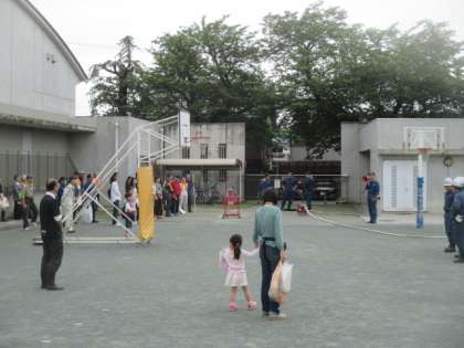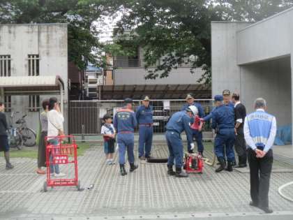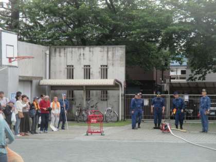 閉会式の後、雨のやんだ校庭で、D級ポンプによる放水訓練を行いました。八幡山町会防災部の皆様による実演を、参加者の皆様に見ていただきました。
