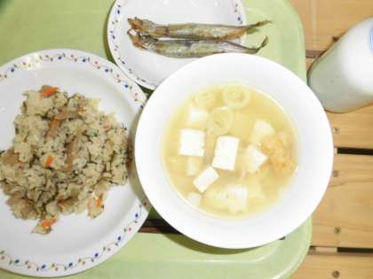 「豚肉とごぼうのごはん、焼きししゃも、味噌汁、牛乳」です。