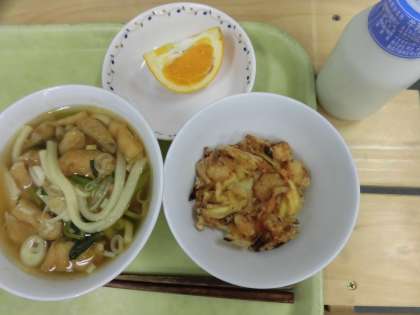 今日は、よく味の染みこんだ「煮込みうどん」でした。具だくさんのうどんに、さつま芋、じゃこ、むきえびの「かき揚げ」がついて、育ち盛りの高学年も、満足できる献立だったと思います。