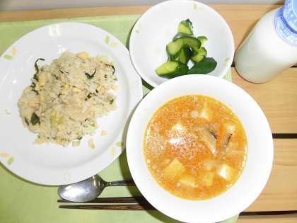 「青菜のチャーハン、きゅうりの甘酢かけ、麻婆汁、牛乳」です。