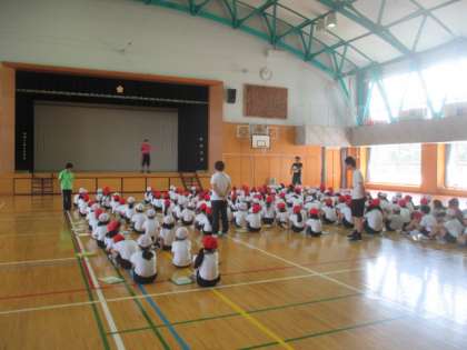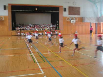 2年生は体育館で、スポーツテストのシャトルランに挑戦しました。ペースを考えて、自分の体力の限界に挑みます。6年生は今回も記録などの手伝いをしました。