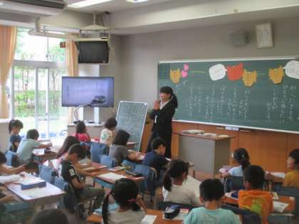 1年2組で実習をしている丸山さんが、道徳の授業を行いました。『橋の上のおおかみ』という資料を使って、子どもたちに温かい心で人に親切にすることの大切さを伝えます。先生の発問に、子どもたちに活発に発言していて、とても活気のあるいい授業になっていました。教育実習もちょうど半分の2週間が経ちました。さらに子どもたちとの関係を深めて、実りのある実習をしていってほしいです。