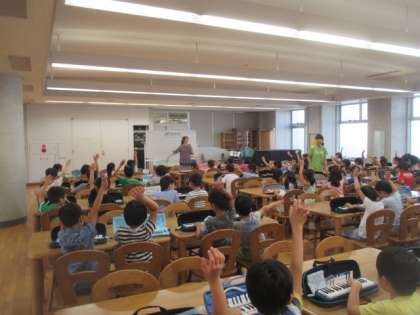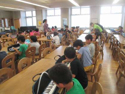 今日から学校公開期間が始まりました。1時間目の1年生は、メロディオンの導入講習会がランチルームで行われました。初めて扱うメロディオンの使い方を、専門業者の講師の先生から教わり、1年生は一生懸命練習していました。そんな意欲的な子どもたちの姿を、公開期間にたくさんご覧なっていただきたいと思います。