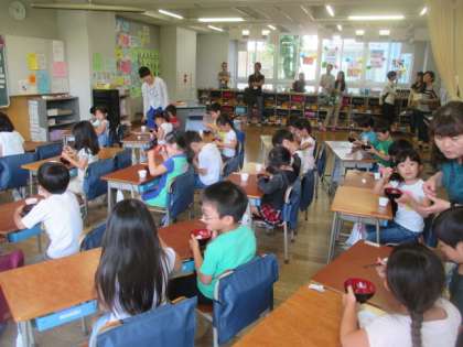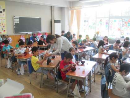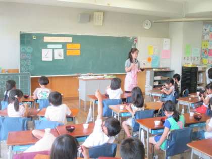 1年生は、学活の時間を使って、「お箸を上手に使おう」という授業を行いました。お箸の持ち方を栄養士の先生から教わり、豆や小さなスポンジなどを実際にはさんで練習しました。みんな上手につかむことができ、笑顔でいっぱいの授業になりました。