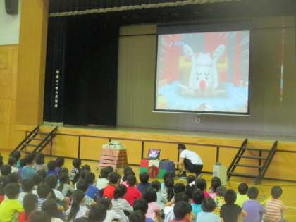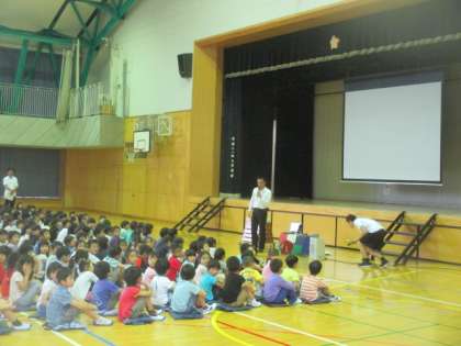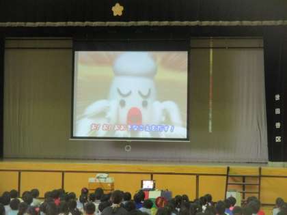 4校時、1年生から3年生は、体育館でセーフティ教室を行いました。成城警察署の生活安全課少年係の刑事の方と、いつもお世話になっている本校スクールサポーターさん、八幡山駐在所の武藤巡査長さんをゲストティーチャーにお招きしてのお話していただきました。低学年では、まず『いかのおすし』のビデオを見て、犯罪被害に遭わないための指導をしていただきました。