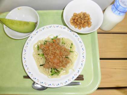 「ジャージャン麺、大豆とじゃこの甘辛揚げ、メロン、牛乳」です。
