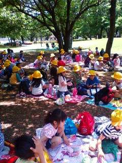 木陰でのお弁当タイムが始まりました。グループで仲良くお弁当を披露しながら食べています。