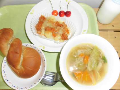 「黒砂糖パン、ポテトグラタン、田舎風スープ、さくらんぼ、牛乳」です。