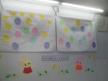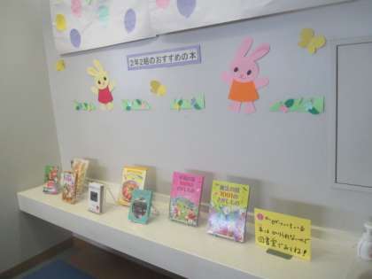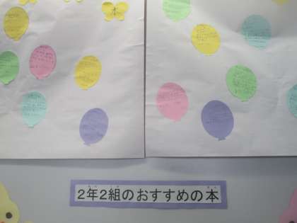 2年2組の根岸教諭と図書館司書が協力して、図書室の壁に2年2組のおすすめの本の紹介をしてくれました。いろいろなジャンルの本が展示されていて、とても興味深いです。雨の日が続いていますので、休み時間に図書室で過ごす時間も多いと思います。ぜひ、展示にも注目してほしいです。
