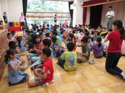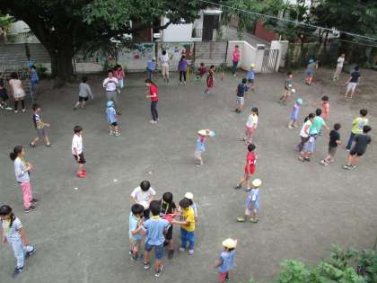 八幡山小学校の5年生と、八幡山幼稚園の年長組の園児との第1回目の交流が、八幡山幼稚園でありました。初回は5年生が幼稚園に出向きました。まずはお互いに自己紹介から始まり、園児たちに園内を案内してもらいました。