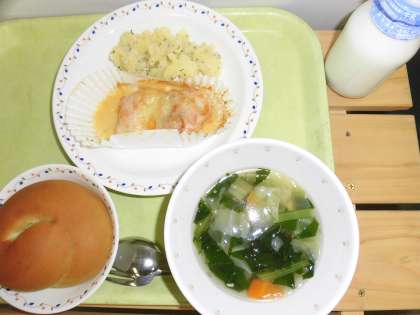 「明日葉パン、鶏肉のチーズ焼き、パセリポテト、野菜スープ、牛乳」です。