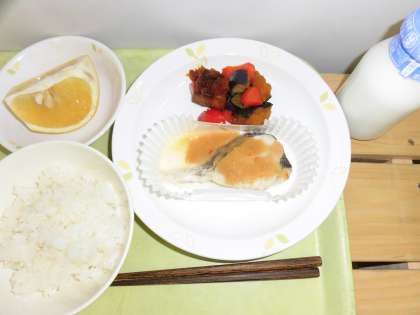 「ごはん、白身魚のピリ辛ソース、夏野菜の南蛮かけ、河内晩柑、牛乳」です。