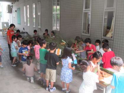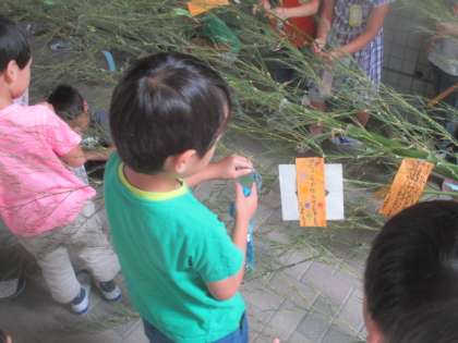 7日の七夕に向けて、各学年で笹飾りを作る準備を進めています。今日は1年生が、地域の方からいただいた大きな笹に、それぞれで願い事を書いた短冊をつけていました。来週には昇降口に設置される予定です。