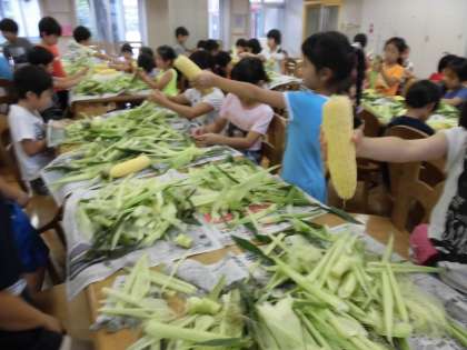 1時間目、今日の給食のメニューである「蒸しとうもろこし」の下処理として、1年生が全員でとうもろこしの皮をむいてくれました。130本もの皮のついたとうもろこしを、1本1本ていねいにむいて、お片付けもちゃんとし、最後に給食室まで届けてくれました。自分たちががんばってお手伝いした今日の給食は、いつも以上にとてもおいしく感じられたのではないでしょうか。