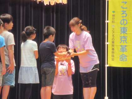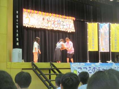 イベントも後半、岩本さんから今日の記念の鉛筆と消しゴムのセットが、子どもたちに渡されました。また、『こころのチャレンジプロジェクト』の宣言カードの説明も受けました。カードに各自目標を書いて、それに向かってがんばることが確認されました。そして、子どもたちからは、今日のお礼として岩本さんに花束を贈呈しました。