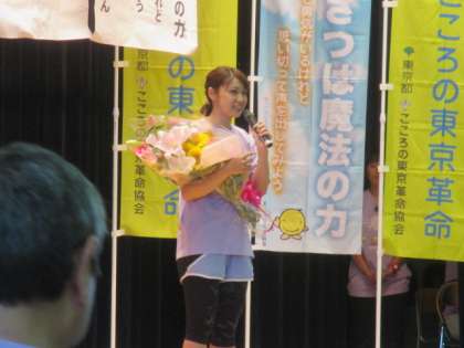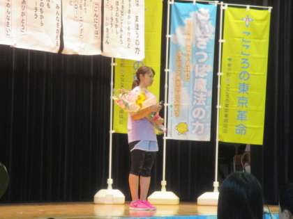 そろそろイベントもクライマックス、あいさつソングの合唱です。『あいさつは魔法の力』を、岩本さんに感謝の気持ちを込めて全員で歌いました。子どもたちの元気な歌声が体育館に響き渡り、高学年のきれいなハーモニーも美しく響き、会場は感動の渦に包まれました。