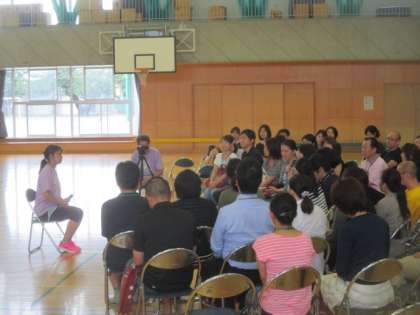 子どもたちが教室に戻った後、本日ご参加いただいた保護者の皆さんと、岩本さんとの懇談会が行われました。親として子どもとまっすぐ向き合う上で、我が子の「しつけ」についての意識を高めていくことを目的として、岩本さんにいろいろな質問をして意見交換を行いました。岩本さんからは、選手としてのご自身の経験や、小さい頃に受けた「しつけ」など、いろいろなお話をしていただきました。短い時間でしたが、とても有意義の懇談会になりました。