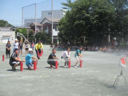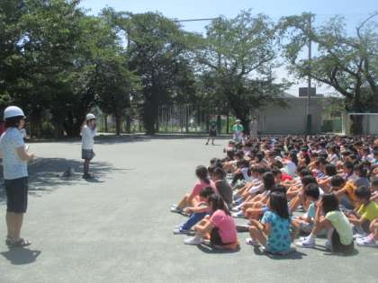 1学期最後の避難訓練は、家庭科室から火事が発生したという想定で行われました。非常階段を使って避難する学年や学級園を通って避難するクラスなどさまざまでしたが、いつもの「お・か・し・も」の約束を守って、上手に避難することができました。その後、烏山総合支所の防災担当の方から、火事の際の初期消火について説明をしていただき、代表の6年生の子どもたちと先生が、実際に消火器を使っての消火体験をしました。