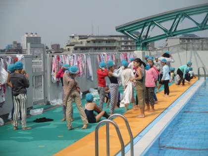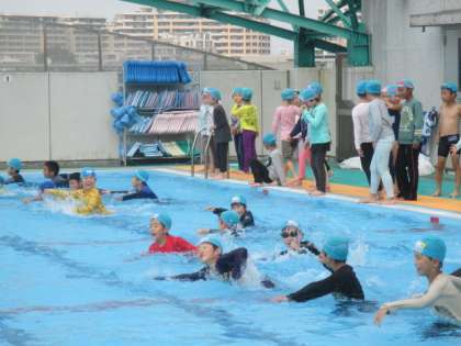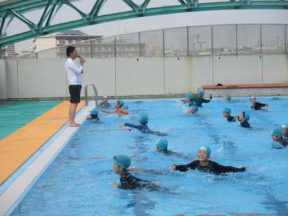 午後、3年生が着衣水泳指導を受けました。担任の先生の実演を見て、着衣で水の中に入ると予想以上に自由がきかないことを実際に体験しました。体験を楽しみながら、水の怖さをあらためて実感できたのではないでしょうか。