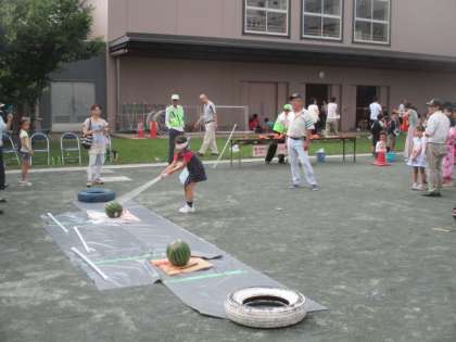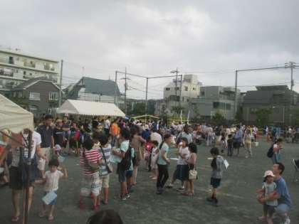毎年この時期恒例となっている、青少年上北沢地区委員会の主催の「子どもまつり」が上北沢小学校で盛大に開催されました。各町会や自治会の協賛をいただき、スイカ割りやヨーヨー釣りなど、さまざまな模擬店やゲームなどがすべて無料で楽しめるとあって、小学校の校庭は大賑わいでした。八幡山小学校のPTAの方々も模擬店を出店し、イベントを盛り上げていただきました。本校校長も参加し、開会に先立ちあいさつをしました。上北沢小の子どもたちと八幡山小の子どもたちが祭りを通して交流し、楽しい夏の午後のひとときとなりました。